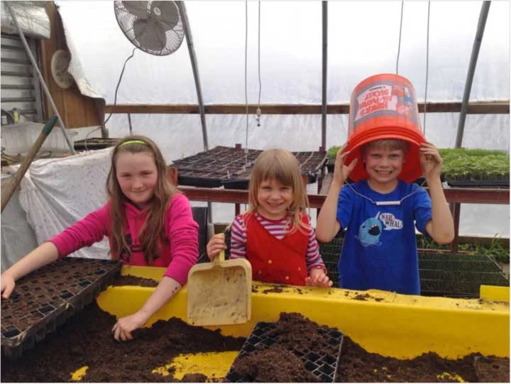 The fast trio of seeders on the farm! Thanks to Ally, Hazel, and Asa, we seeded 75 trays of corn last week!