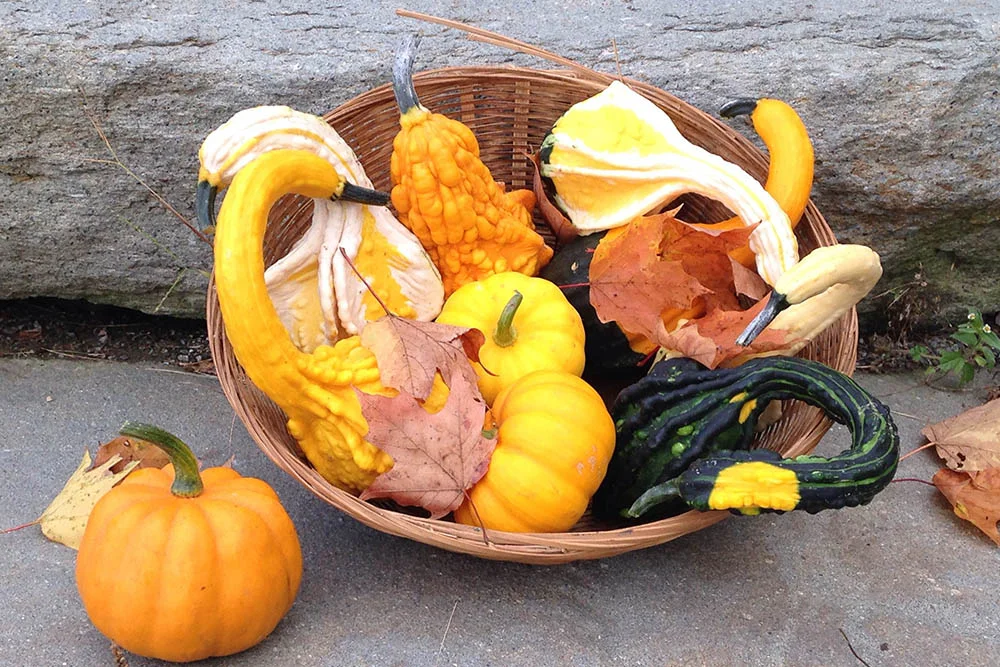 These delicate little gourds shown above go perfectly with the falling leaves. A delightful addition to your porch, table, or bedroom.
