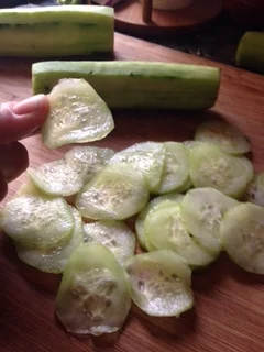 Peel and slice 2 cucumbers paper thin, so they are limp, use a veggie slicer or mandolin on the thinnest setting.