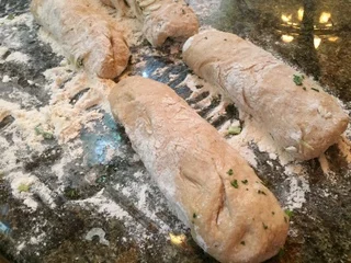 Roll or knead each piece of the dough while mixing in the salt, red pepper flakes, scallions/green onion, and a few teaspoons of oil. I like to add a few, roll the dough into a ball, add a few more, roll it into a log, add a few more, coil the log, add a few, and roll it back into a ball. Try to keep the oil on the inside of the dough (make a depression, add a bit, and roll it in) to keep the rolling surface clean.
