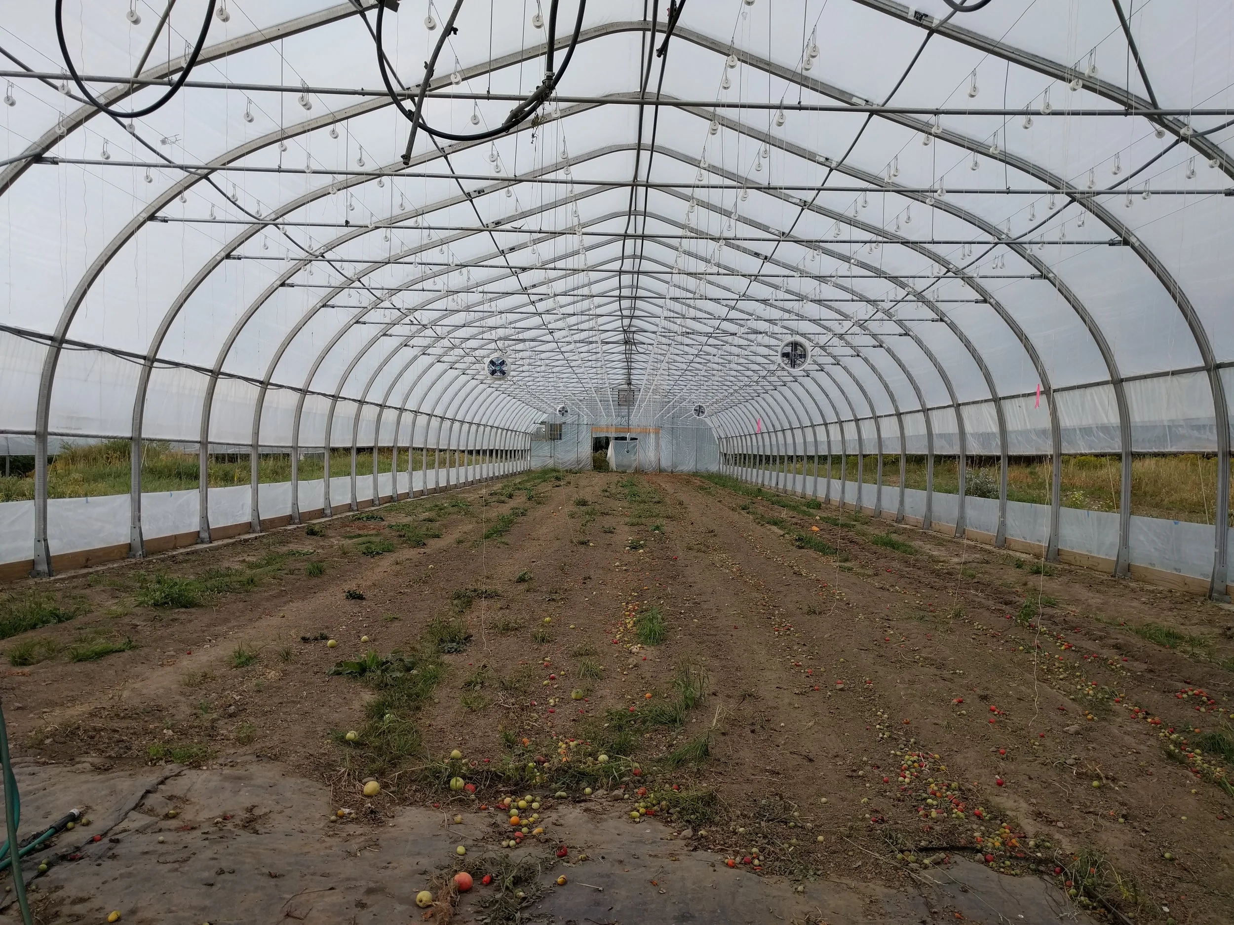 Once the tomato plants are out of the hoophouses we weed, fertilize, reset our planting beds, lay new driplines for irrigation and get ready to plant winter greens!