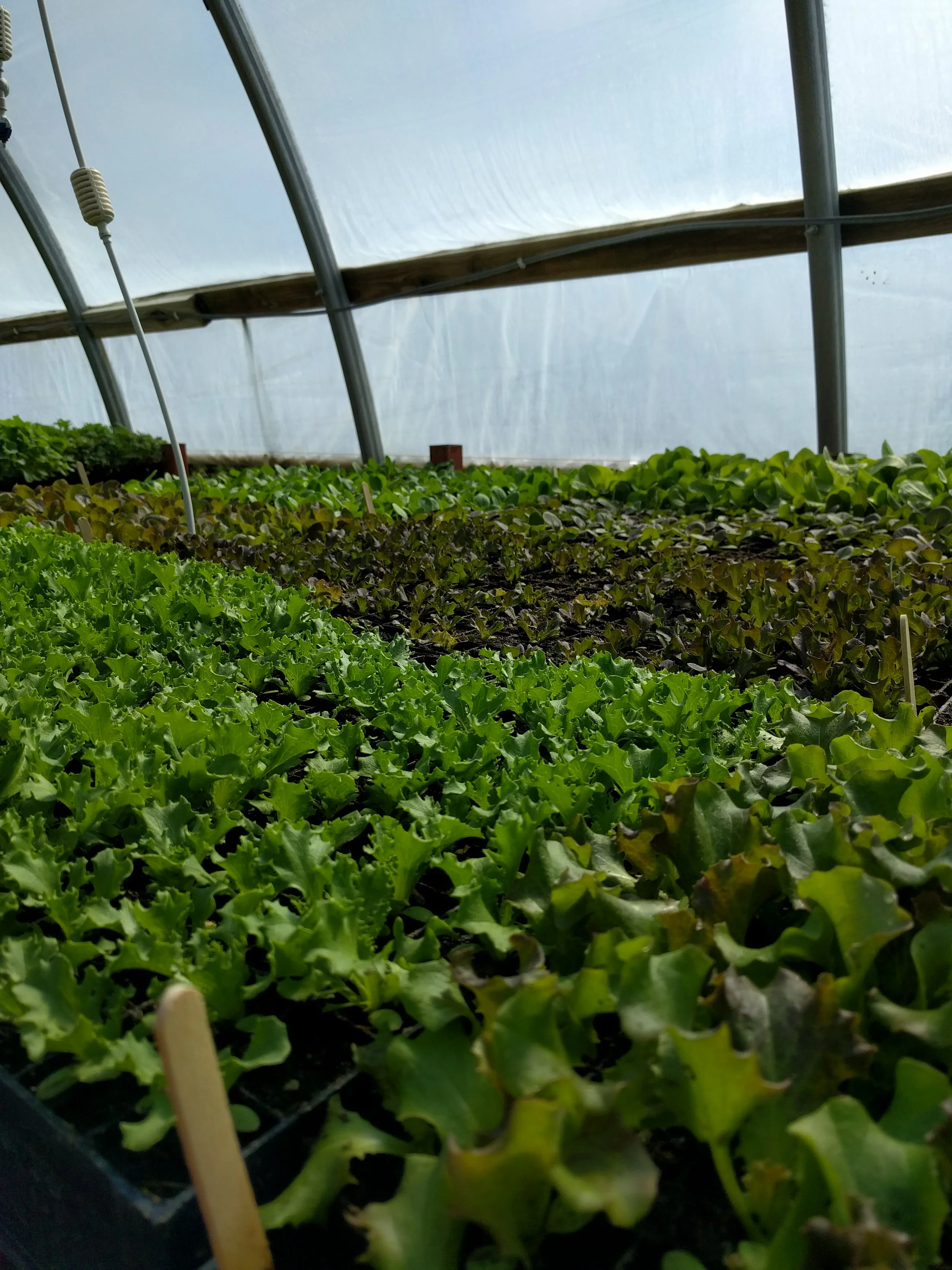 By mid-December the hoophouses are growing lush greens like this!  Starting in late December or early January we very minimally heat (30F at night) these two large hoophouses with a biomass furnace that burns wood pellet or dry corn to heat hot water that is pumped underground beneath the planted beds. The little ground heat and a remay blanket at night is all these cold-hardy greens need to be happy through cold January nights.