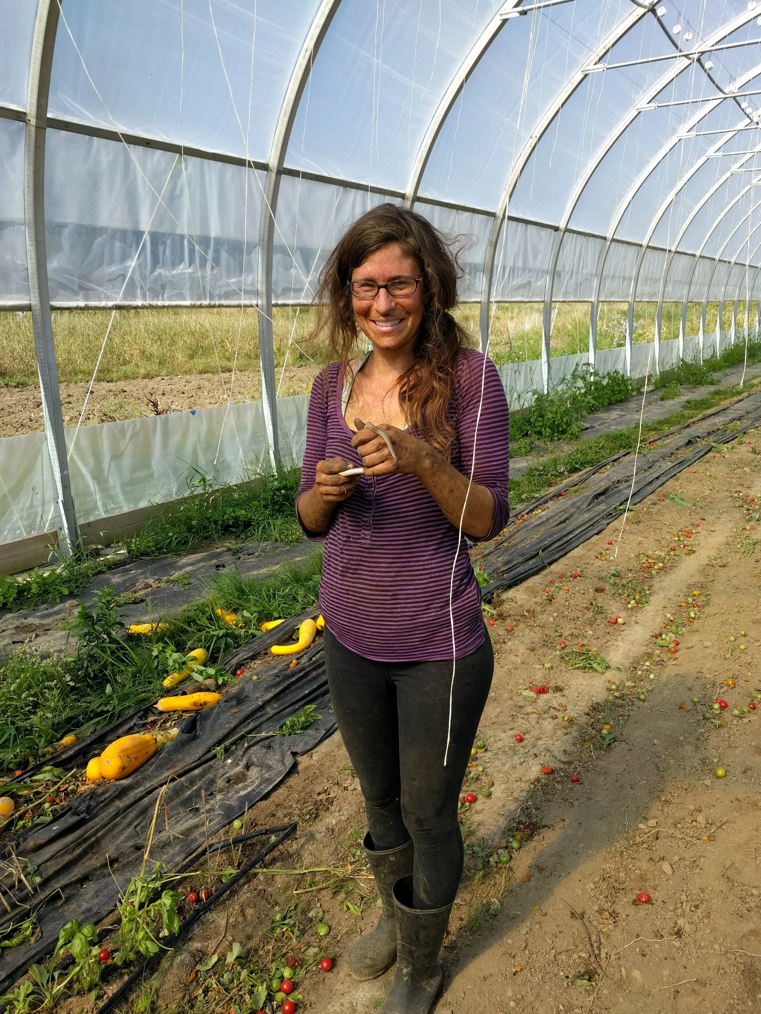 Pulling tomato plants gets a little messy. Liz found plenty of dirt and a little friend in the process.